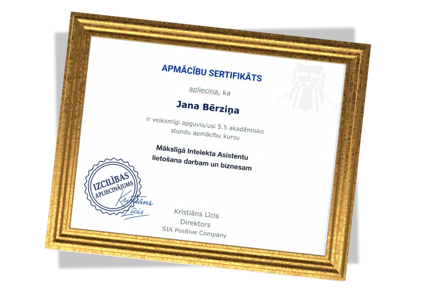 Apstiprina Tavas MI prasmes – sertifikāts ir oficiāls apliecinājums Tavām zināšanām par MI asistentu lietošanu.